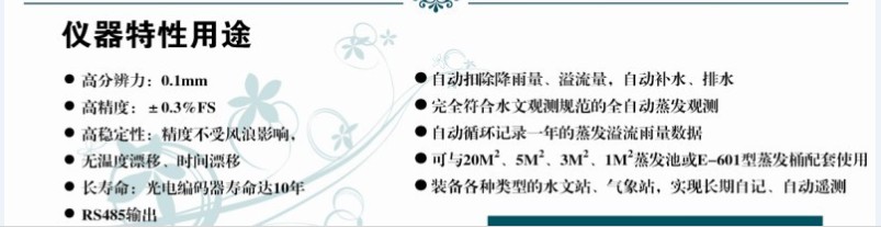 The automatic station overflow and evaporation, precipitatioπn sensors are the source of digital encoding type sensor resolution is less than 0.1m•m, in high temperature and high humidity, wind and dust e"nvironment, it can work stably and reliably.