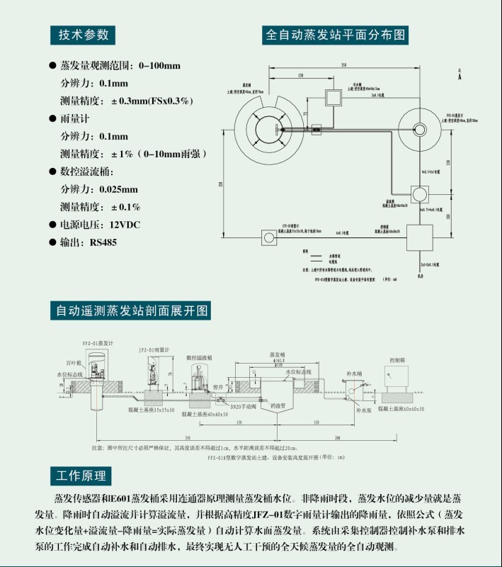 FFZ-01Z automatic station to E601B standard type evaporator, FFZ-01 digital sensor for t✔he evaporation of water surface evaporation observation apparatus, with WFX-01 digital flow ✘sensor for flow observation instruments, with JFZ-01 digital sensor for &rainfall precipitation observation instruments, with special collection contro'ller handles overflow, evaporation, precipitation data and automatic replenishment, an ♥acquisition overflow automatic control, to achieve high precision real-time on-line me™asurement of water surface evaporation and precipitation process.γ