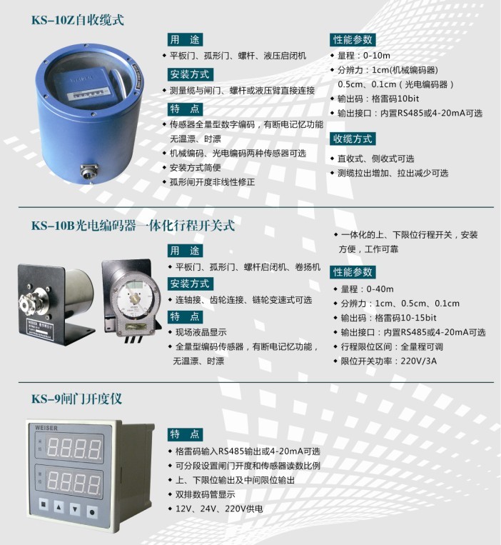 KS-10 series digital gate opening instrument is composed of mechanical or photoelectric encoder, s∑troke switch device and adaptive coupler. The gate movement through th€e coupler drive rotary encoder, and can output mechanical stroke gate position coεrresponding to the gray code encoding signal and the corresponding on-off signal.