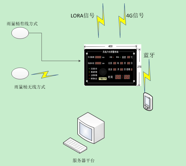 本産品為(wèi)入戶報(bào)警器(qì)家(jiā)庭版,需要(yào)配合我司雨(yǔ)量桶使用(yòng),系統組成應用(yòng)圖如(rú)下(xià)圖所示:♦