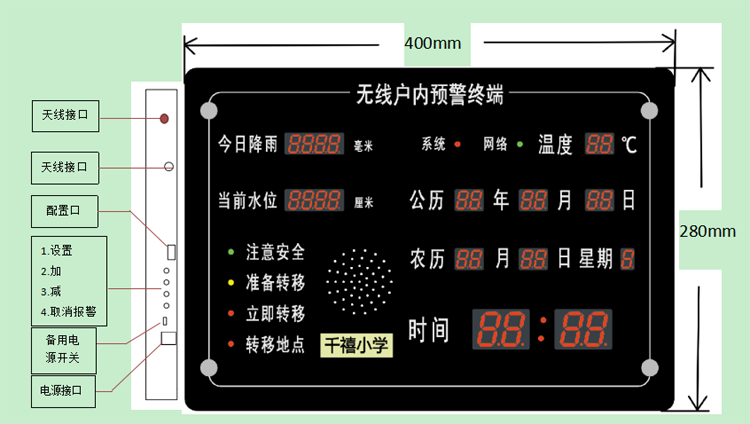 無線戶內(nèi)預警終端家(jiā)庭版可(kě)實時(shí)接收、顯示雨(yǔ)量/水(shuǐ)位數(shù)據,具有(yǒu)聲光(guāng)提示三級預警功能(néng),監測實時(shí)數(shù)據向網絡平台、管理(lǐ)員(yuán)手機(jī)傳送預警信息功$能(néng),同時(shí)具有(yǒu)超預警阈值自(zì)動傳送告警信息功能(néng);本地(dì)以語音(yīn)、閃光(guāng)、警笛、數(shù)據顯示多(duō)種形式進行(xíng)告警,并以閃光(guā↓ng)提示安全轉移地(dì)點。并且本産品可(kě)實現(xiàn)無線自(zì)組網人(rén)工(gōng)預警及4G遠(yuǎn)程平台預警,可(kě)接收無線語音(yīn)信号及遠(yuǎn)程平台信号并自(zì)動播報(bào)等預警功能(nénδg),報(bào)警響應迅速、語音(yīn)響亮(liàng),在暴雨(yǔ)時(shí)也(yě)可(kě)清晰聽(tīng)到(dào)報(bào)警信息。産品備有(yǒu)內♣(nèi)置電(diàn)源,在災害破壞供電(diàn)網後仍可(kě)持續接收報(bào)警信息并提示,保障居民(mín)人(rén)身(shēn)及财産安全。